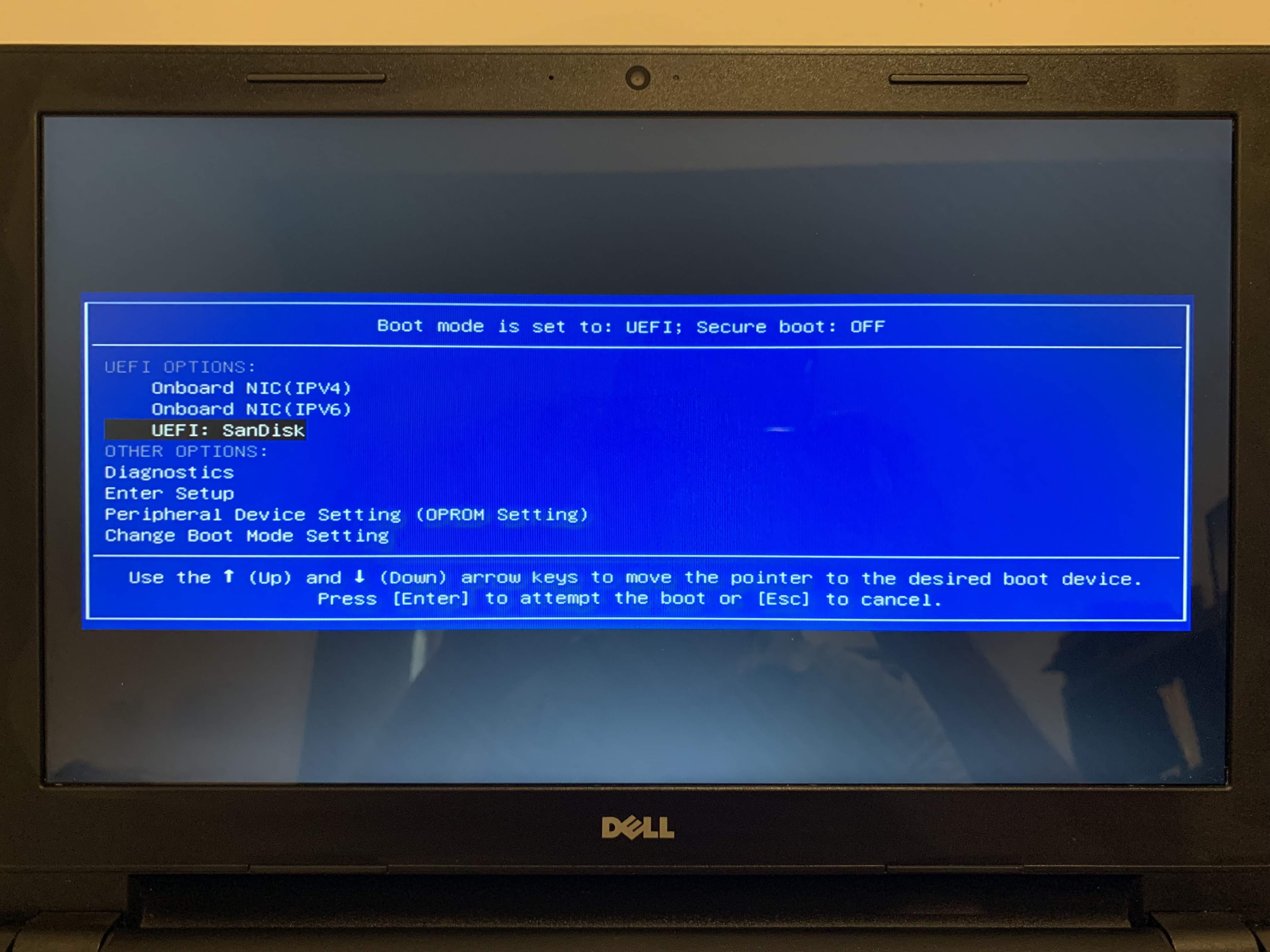 Once the SSD is installed and the device reassembled, insert your bootable USB and power on the device. Each device will have a specific key to boot from the USB. The Dell pictured here utilised F12.
