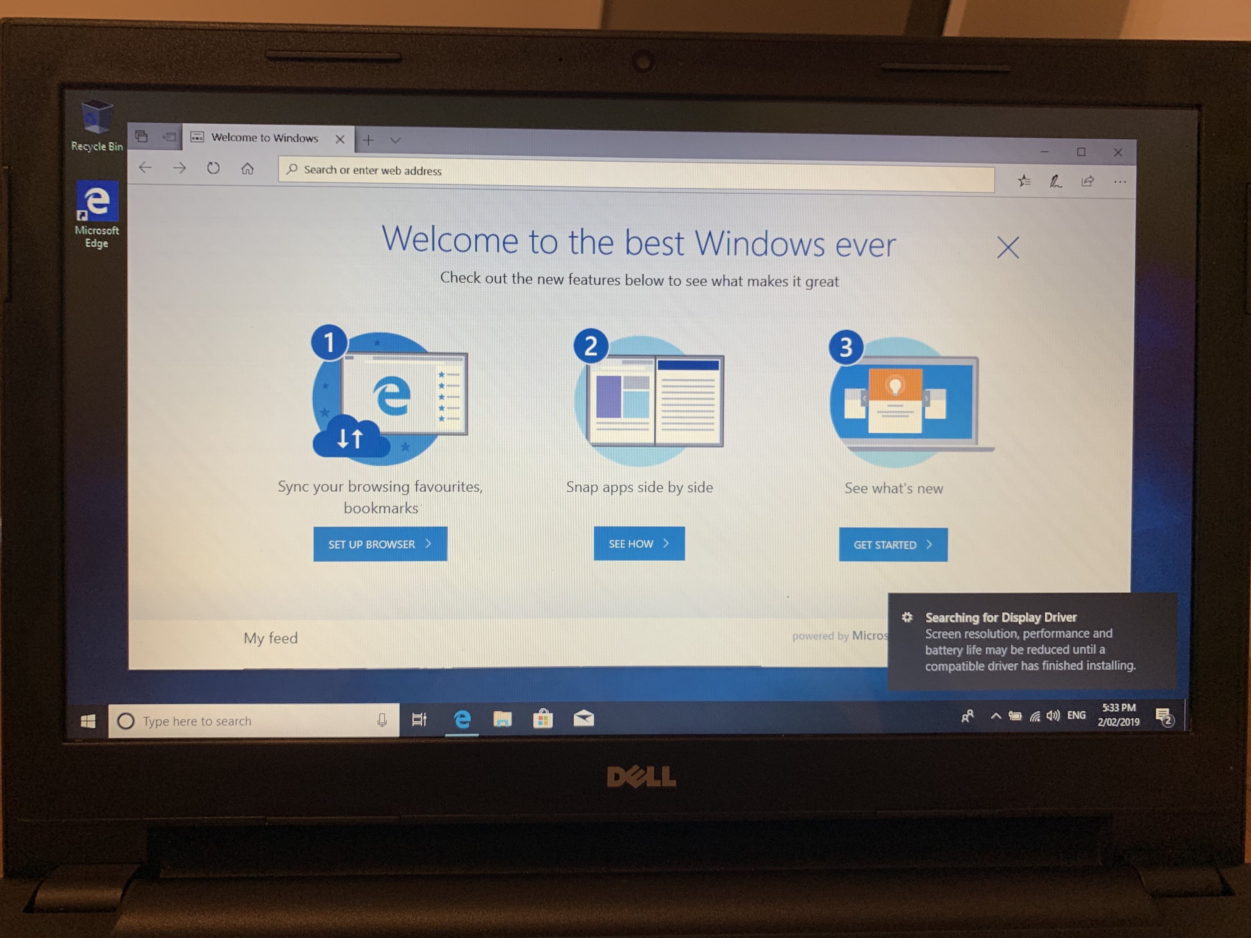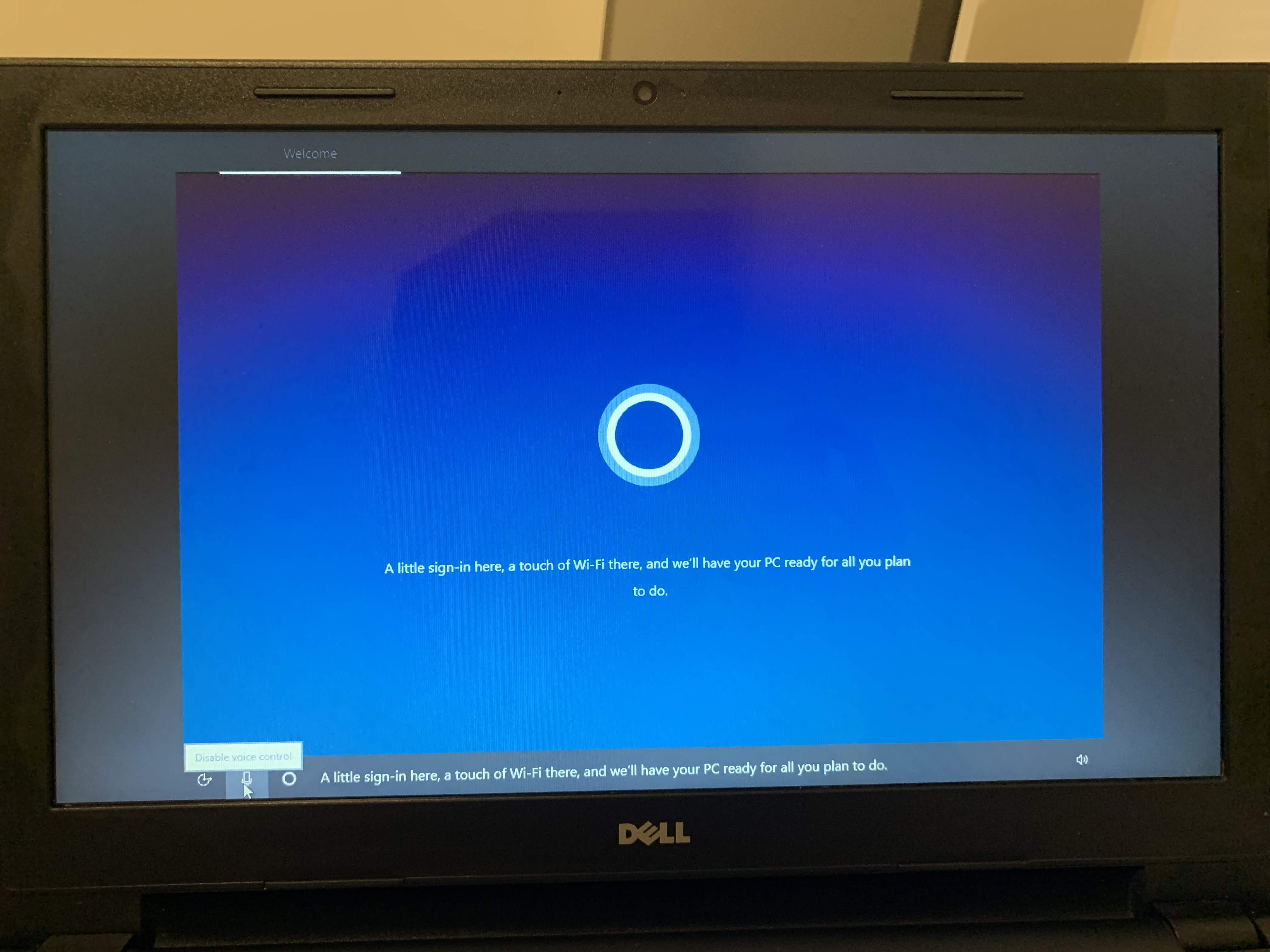 The Windows 10 welcome screen will appear after a rebooting automatically. Feel free to press the microphone icon [bottom left of screen] to silence the Cortana setup voice over. When prompted, enter the WiFi details, accept the default settings.